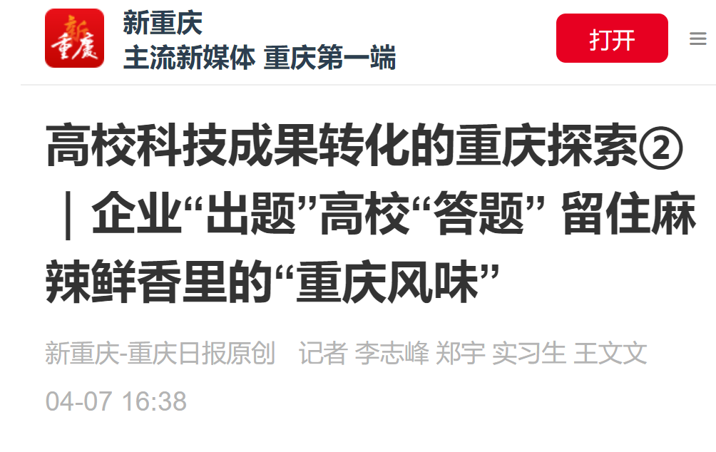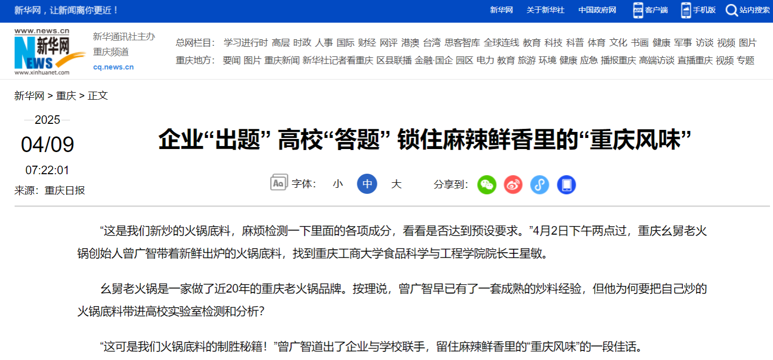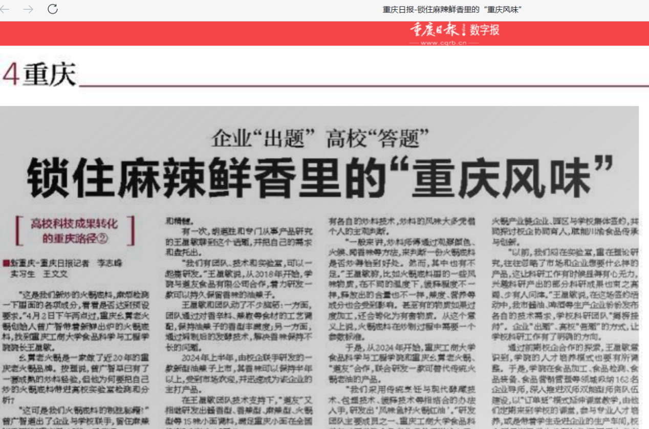 重庆日报、新重庆客户端、新华网于4月9日报道了9428cn太阳集团古天乐紧密围绕食品与农产品加工产业,携手企业,在科技研发、人才培养等产学研合作情况。积极与企业深度合作,探索出一条“企业出题、学校答题”的协同创新路径。成功研发出“风味鱼籽火锅红油”等重庆风味系列产品,为校企科技成果转化、协同育人创新提供“四链”融合范例。