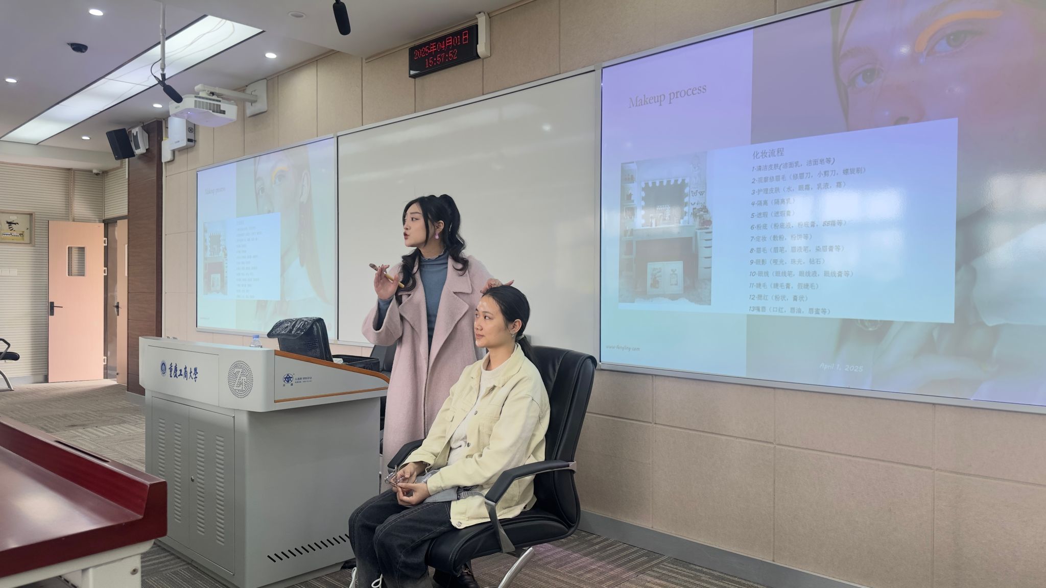 职业形象:细节彰显专业态度。“得体的妆容和着装是职业素养的外化表达。”峰翎职业培训学校高级化妆师张莉老师以“职场第一印象”为主题,通过现场演示与案例对比,系统讲解求职妆容、发型及服饰搭配技巧。在场学生积极参与互动,张老师逐一纠正仪态细节,并推荐了适合不同场合的“高性价比”职场妆容、穿搭方案。